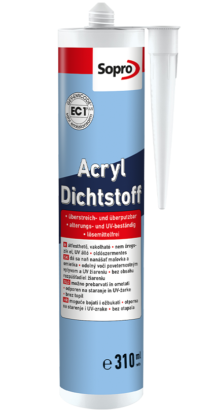 Spritzfähiger Dichtstoff auf Acrylat-Dispersionsbasis zum plastischen Füllen von Anschluss- und Bewegungsfugen zwischen saugfähigen Baustoffen wie Fliesen, Putz, Beton, Mauerwerk, Holz u. a.