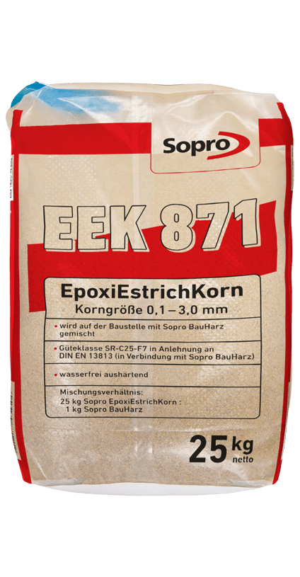 Sopro EpoxiEstrichKorn mit speziell abgestufter Sieblinie ergibt in Verbindung mit Sopro BauHarz einen schnell abbindenden und früh belegereifen Kunstharzmörtel der Güteklasse SR-C25-F7 in Anlehnung an EN 13 813. Hohe Abrieb-, Druck-, Biegezug- und Abreißfestigkeiten. Für dünne Ausgleichsschichten ≥ 15 mm im Verbund. Auch auf Trennlage sowie für die schwimmende Verlegung geeignet. Ideal im Sanierungsbau. Auch geeignet zur Herstellung von Dickbettund Ansetzmörteln in Verbindung mit Sopro TrassBinder.