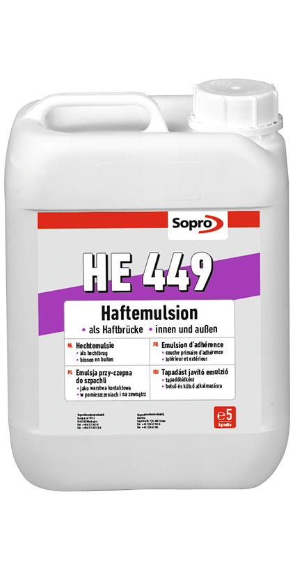 Kunstharzdispersion als Haftbrücke für mineralische Putze und Spachtelmassen (z. B. Sopro FS 15® plus). Für die „Frisch in frisch“-Verarbeitung. Zum Vergüten von Mörteln, Estrichen und Schlämmen.