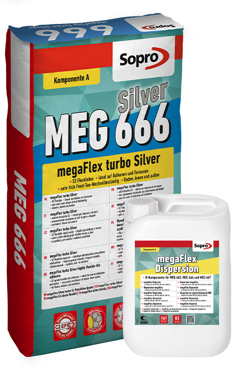 Silbergrauer, zweikomponentiger, zementärer, hoch flexibler, Fließbettmörtel, C2 FE S2 nach DIN EN 12004, für die besonders sichere Verlegung von Feinsteinzeug-, Beton- sowie Naturwerksteinplatten. Auf jungen, unbeheizten Zementestrichen (Fliesen und Platten mit Kantenlänge max. 60 cm), sowie auf Fußbodenheizungen durch spannungsabbauende Wirkung der Mörtelmatrix. Ideal für Balkone und Terrassen. Hohe Sicherheit für die Verlegung bei niedrigen Temperaturen. Geeignet für Groß- und Megaformate über 120 cm Kantenlänge am Boden. Sehr hohe Verseifungsbeständigkeit und Flexibilität. Hohe und dauerhafte Frostsicherheit durch sehr geringe Wasseraufnahme und Wasserundurchlässigkeit.
