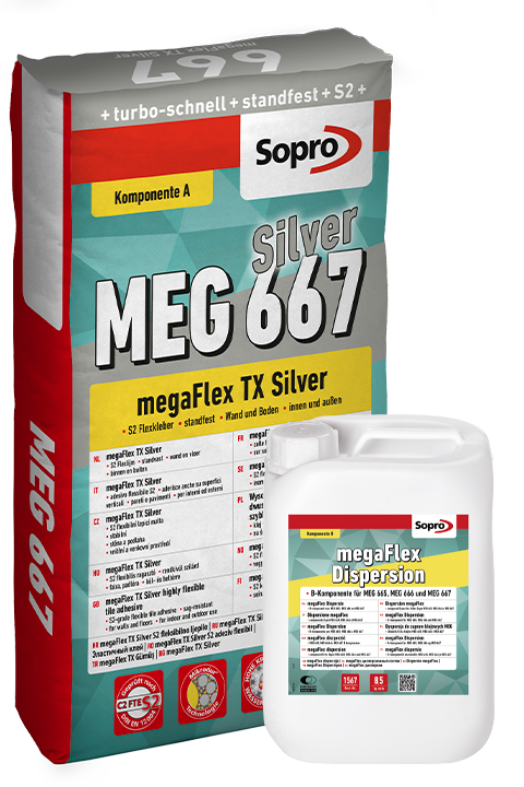 Silbergrauer, zweikomponentiger, zementärer, schnell erhärtender, hoch flexibler, standfester Fliesenkleber, C2 FTE S2 nach DIN EN 12004. Zum Ansetzen und Verlegen von Steinzeug, Feinsteinzeug, Beton- und Naturwerksteinplatten. Auf jungen Betonuntergründen sowie jungen, unbeheizten Zementestrichen (Fliesen und Platten mit Kantenlänge max. 60 cm) sowie auf Wand- und Fußbodenheizungen durch spannungsabbauende Wirkungder Mörtelmatrix. Besonders geeignet für Anwendungen im Außenbereich, z. B. auf Balkonen und Terrassen und bei erhöhten Anforderungen an die Flexibilität des Mörtelsystems. Für Fassaden, Treppenanlagen sowie Schwimmbäder. Geeignet für Groß- und Megaformate ab 120 cm Kantenlänge an Wand und Boden. Sehr hohe Verseifungsbeständigkeit und Flexibilität. Hohe und dauerhafte Frostsicherheit durch sehr geringe Wasseraufnahme.