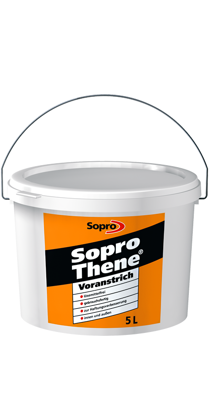 Schnell trocknender, lösemittelfreier, gebrauchsfertiger und geruchsarmer Voranstrich auf Bitumen-Kautschukbasis. Zur Vorbehandlung von mineralischen Untergründen für die nachfolgende Abdichtung mit SoproThene® Bitumen-Abdichtungsbahn.