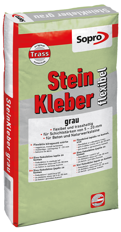 Grauer, zementärer, flexibler, trasshaltiger Mittelbettmörtel zum Verlegen von Pflastersteinen und Pflasterplatten aus Beton- oder Naturwerksteinen.