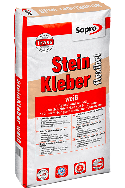 Weißer, zementärer, schnell erhärtender, flexibler Mittelbettmörtel für Mörtelbettdicken von 5 bis 20 mm zum Ansetzen und Verlegen von gleichmäßig dicken Naturwerksteinplatten, Solnhofer Natursteinplatten, Juramarmor, Natursteinfliesen, auch im Unterwasserbereich. Sehr hohe Sicherheit gegen Verfärbungen durch die 4-fach Sicherheit TRASSWEISS-SCHNELL-FLEXIBEL