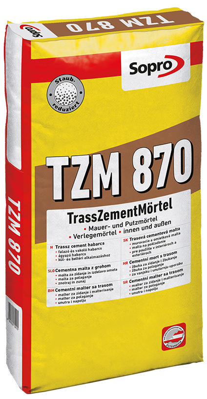 Hydraulischer Trockenfertigmörtel mit Trass, Putzmörtel nach ÖNORM EN 998-1, GP, CS IV, Wc0, vor allem im Keller- und Sockelbereich; Mauermörtel nach ÖNORM EN 998-2, M10, Dickbett-Verlegemörtel für Natursteine, Platten und Fliesen.